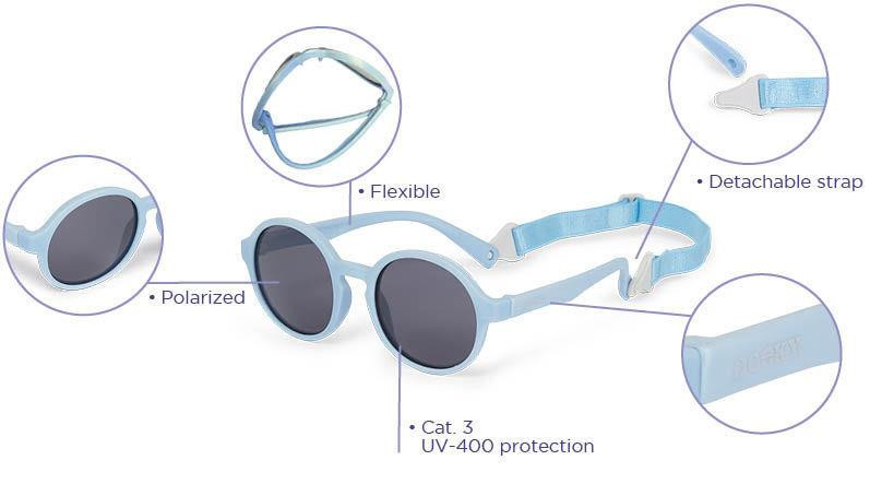 Okularki przeciwsłoneczne dla dzieci 6-36 miesięcy chronią oczy w słońcu podczas spacerów, wyjazdów i zabawy na zewnątrz. Dooky Fiji mają polaryzację, filtr UV-400 (Kat.3), okrągłe oprawki i odpinany pasek ułatwiający dopasowanie.