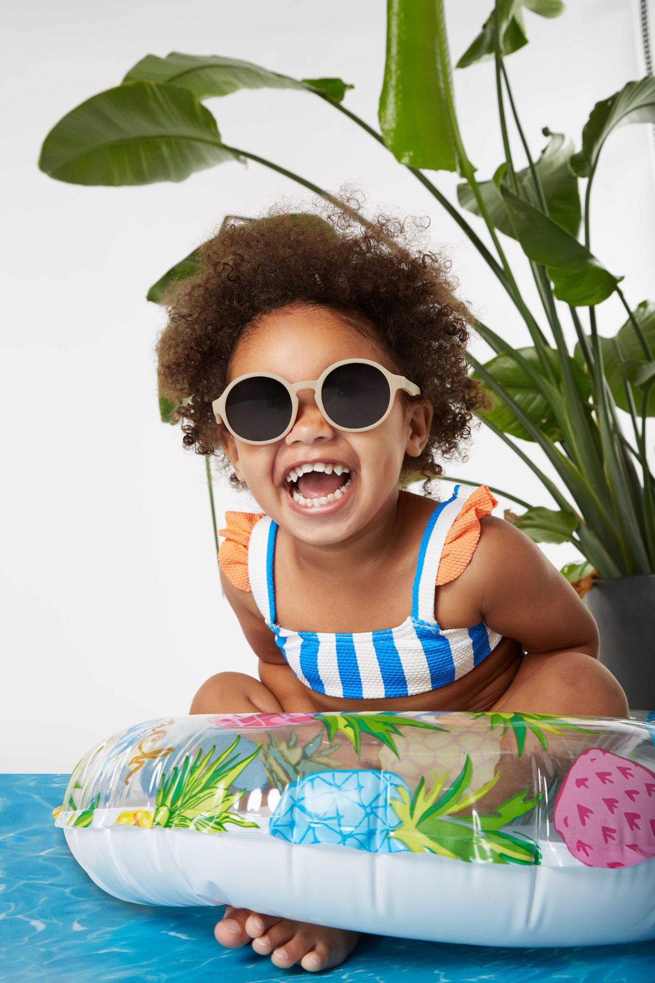 Model ma odpinany pasek oraz elastyczne zauszniki, co pomaga lepiej dopasować okularki do główki dziecka. Takie rozwiązanie zwiększa komfort podczas spacerów i zabawy na zewnątrz.