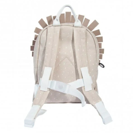 Plecak posiada usztywnione plecy, regulowane szelki wraz ze stabilizującym zapięciem piersiowym oraz praktyczny uchwyt. Wyposażony w dużą przegrodę na ulubioną przytulankę, książeczkę, bidon z piciem i ubranka na zmianę oraz małą przegrodę na łakocie. Obie przegrody zapinane na suwak.