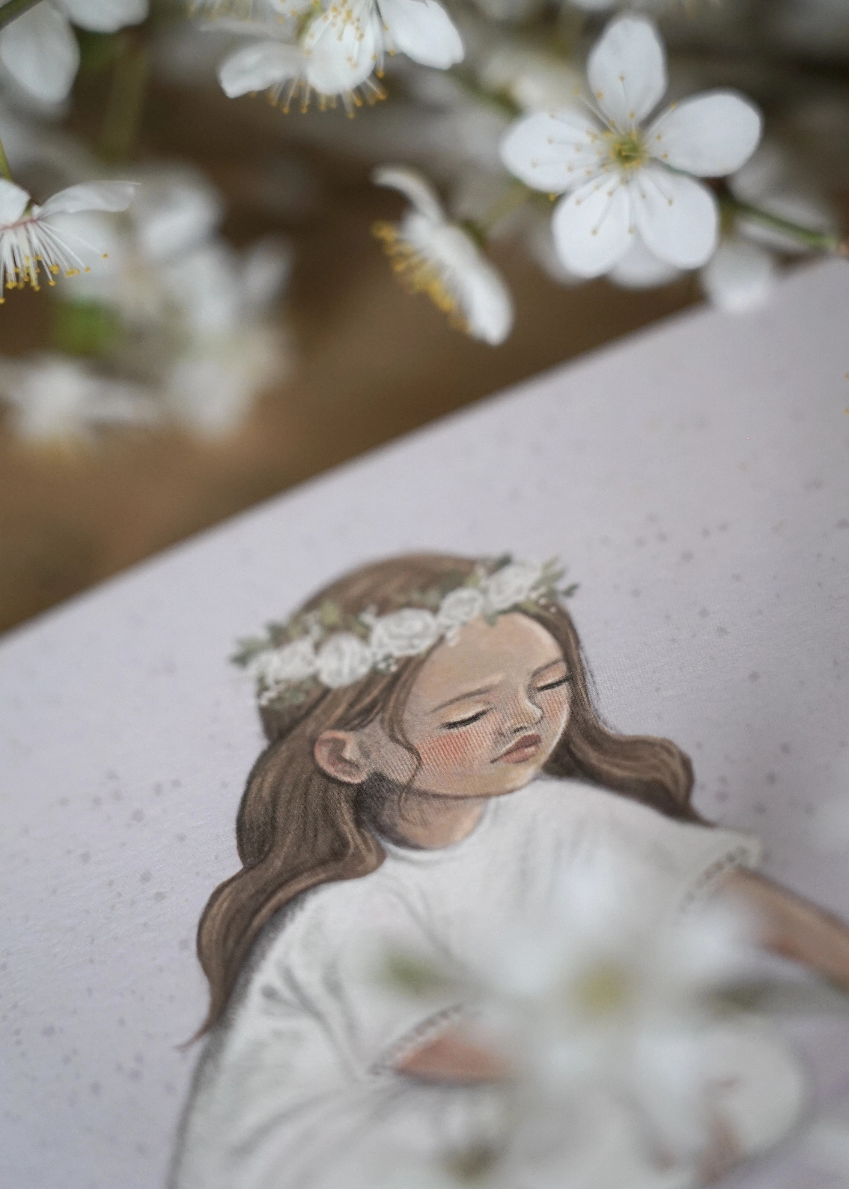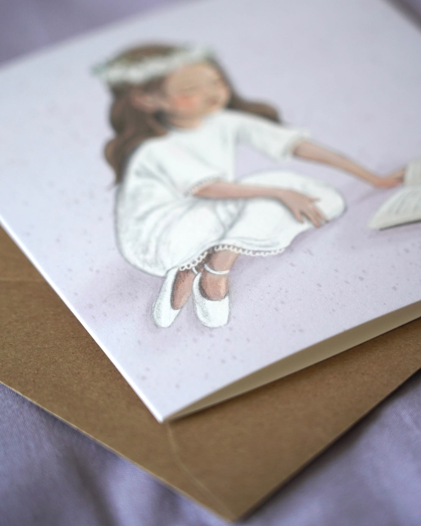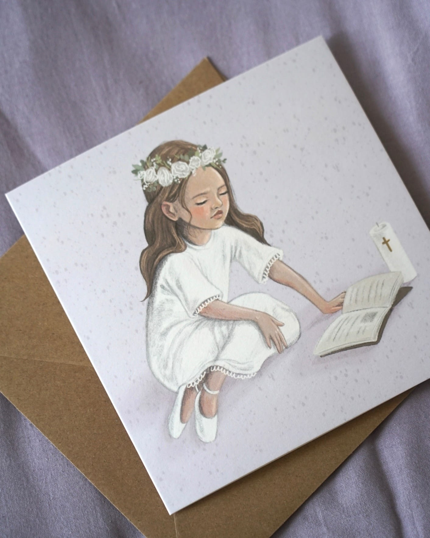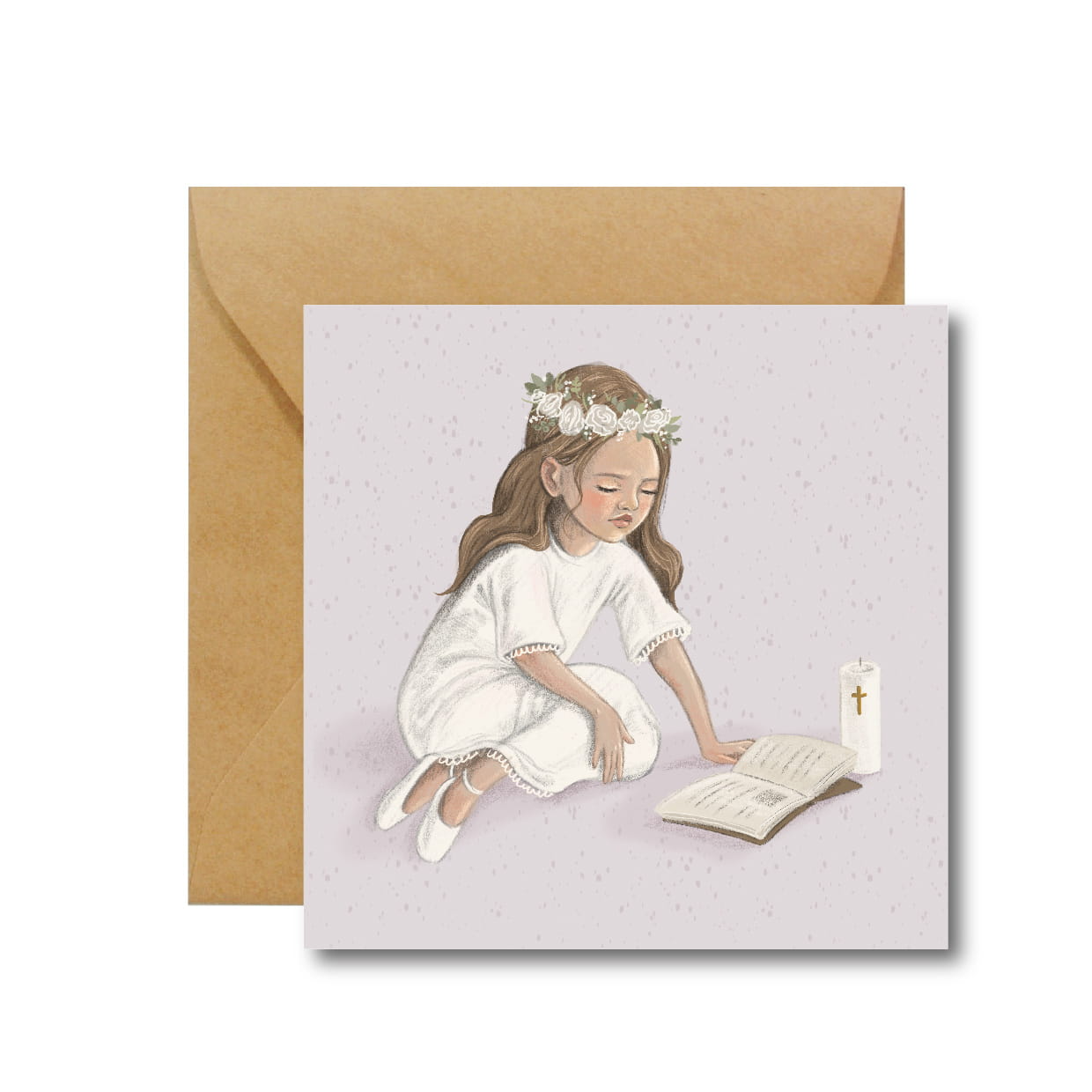 Na froncie kartki znajduje się ilustracja dziewczynki w jasnej komunijnej stylizacji, z wiankiem na głowie, przedstawionej w spokojnej, skupionej pozie. Obok widoczna jest świeca oraz modlitewnik, co buduje czytelny i spójny kontekst Pierwszej Komunii. Całość została utrzymana w łagodnych odcieniach bieli, beżu i pastelowego różu z nutą lila, dzięki czemu kartka wygląda delikatnie i elegancko. Taki projekt dobrze pasuje do uroczystości rodzinnej i religijnej, a jednocześnie zachowuje lekkość i estetykę autorskiej ilustracji.