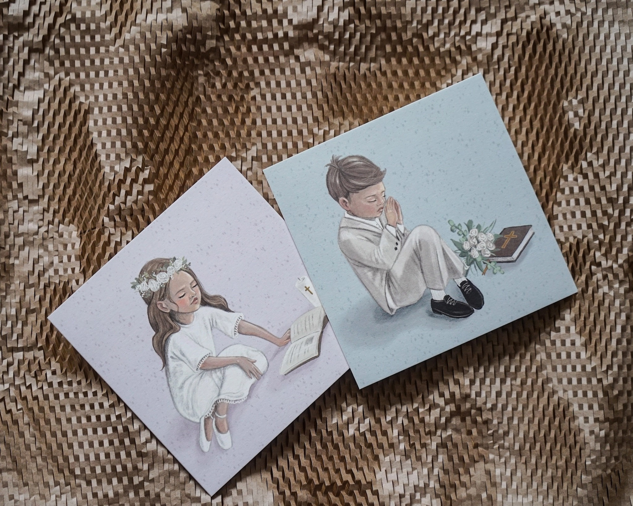 Kartka została ręcznie zilustrowana z dbałością o szczegóły, co widać w opracowaniu postaci, stroju komunijnego i spokojnego tła. Tego typu ilustracja nadaje produktowi bardziej autorski charakter niż masowe wzory okolicznościowe. Do każdej kartki dołączona jest koperta w naturalnym kolorze, dzięki czemu całość jest gotowa do wręczenia od razu po zakupie. To praktyczne rozwiązanie dla osób, które chcą zadbać o ładną i spójną oprawę życzeń.
