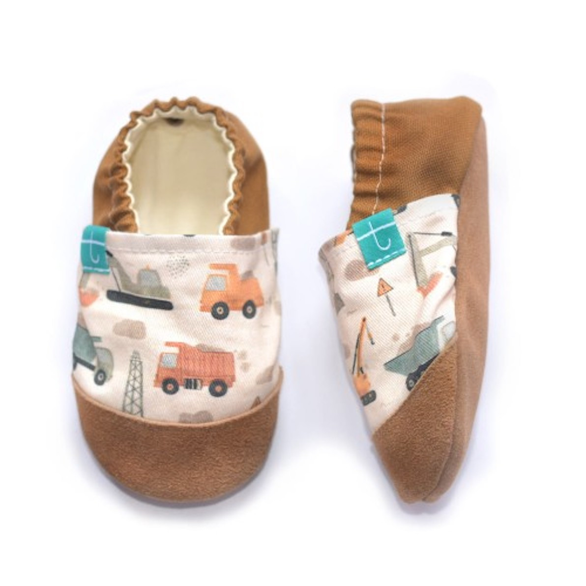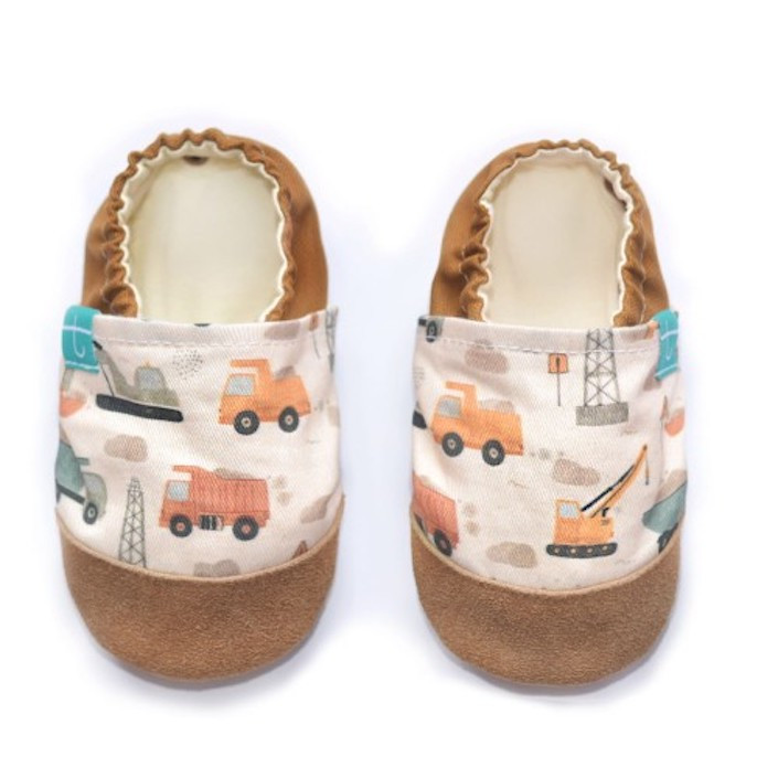 City Builders – papcie Titot z motywem pojazdów budowlanych dla dzieci. Skórzana podeszwa, wygodne, elastyczne i bezpieczne dla małych stóp.