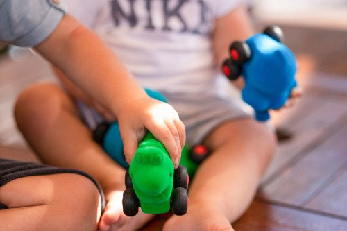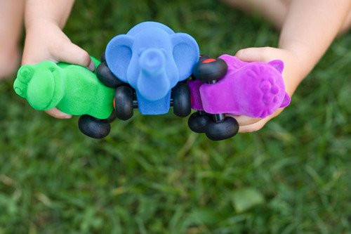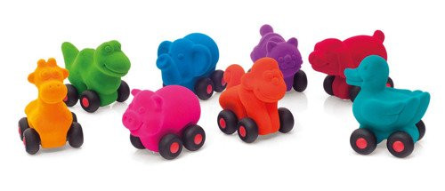 Wszystkie zabawki są wyjątkowo miękkie i przyjemne w dotyku, mają jaskrawe kolory i czarne kółka. Dzięki prostej formie i stymulującej teksturze świetnie rozwijają dziecięcą wyobraźnię. Pojazdy są lekkie, a ich niewielkie rozmiary (ok. 10 cm długości) idealnie pasują do małych rączek, zachęcając maluchy do chwytania i poruszania. Są w pełni bezpieczne, także dla niemowląt. Oryginalnie wyprofilowane kształty sprawiają, że zabawa nimi wspiera rozwój małej motoryki. Dla starszych dzieci sterowanie pojazdami to z kolei lekcja koordynacji ręka-oko. Można je bezpiecznie rzucać i ściskać.
