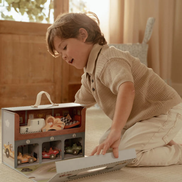 Przenośny tor wyścigowy Little Dutch w praktycznej walizeczce. Zawiera autka, figurki, podium i puchar. Idealny do podróży i zabawy w wyścigi od 18 miesięcy.