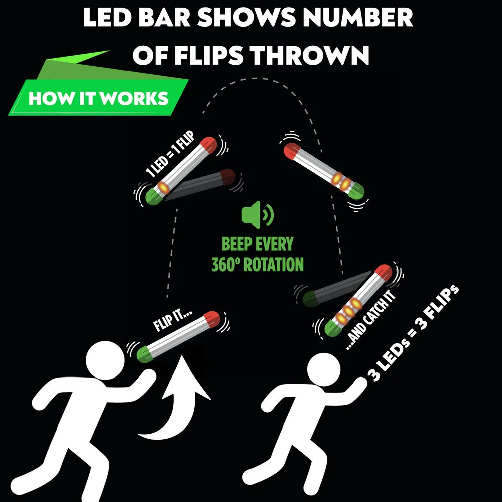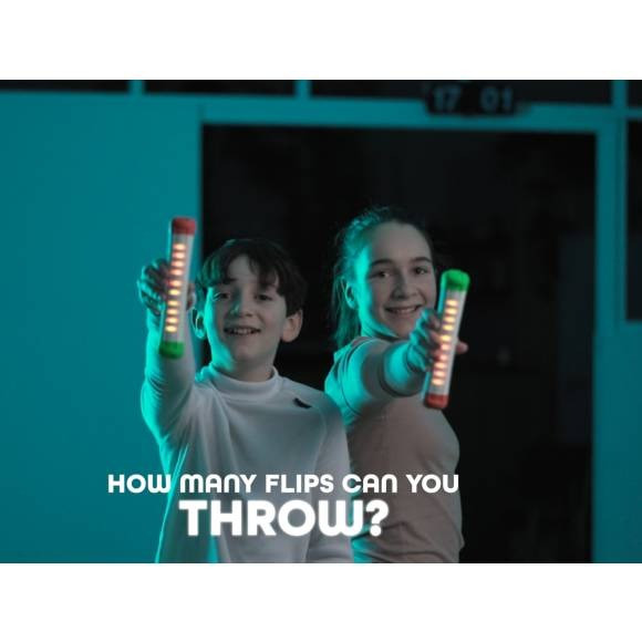 Podczas rzutu Stickflip wykonuje widowiskowe obroty w powietrzu. Każdy pełny obrót o 360° rejestrowany jest automatycznie – usłyszysz sygnał dźwiękowy, a pasek LED pokaże dokładnie liczbę zaliczonych flipów. Wystarczy złapać Stickflip, aby sprawdzić swój wynik i bić kolejne rekordy!