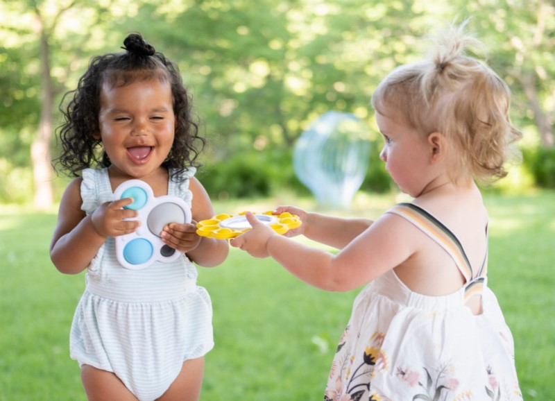 Klasyczne Bąbelki Dimpl w kształcie mięciutkiej chmurki i ciepłego słonczeka. Dimpl Słoneczko ma w środku dwustronne lusterko, a żółte promyki wokół lusterka to silikonowe bąbelki. Dla dzieci 10 miesięcy +.