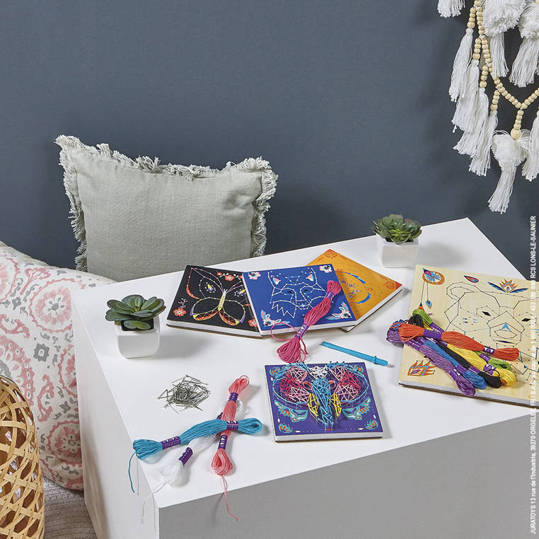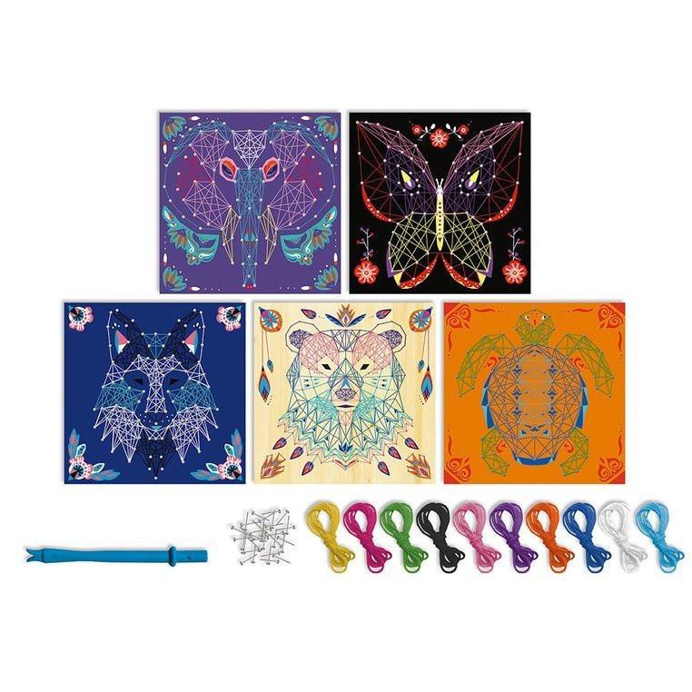 String Art Zwierzęta (J07912) francuskiej marki Janod to zestaw kreatywny, który wprowadza dziecko w ciekawą technikę nawlekania kolorowych nici między punktami, tworząc abstrakcyjne, geometryczne wzory. To praca przestrzenna, a efektem są niebanalne „sznurkowe obrazy”, które mogą stać się dekoracją dziecięcego pokoju i źródłem dumy z własnoręcznie wykonanych prac.