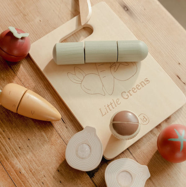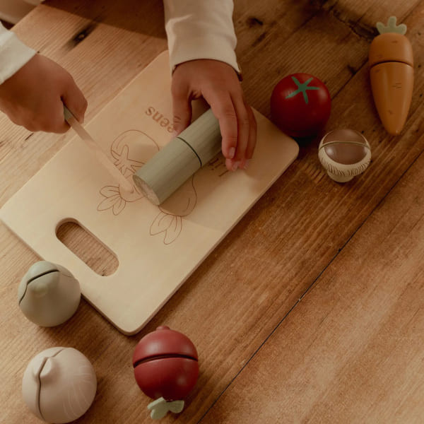 Deska do krojenia z warzywami Little Dutch to drewniana zabawka edukacyjna dla dzieci od 2 lat, która zachęca do zabawy w kuchnię i nauki krojenia. Zestaw z warzywami na rzepy, deską i bezpiecznym nożykiem wspiera odgrywanie ról oraz oswajanie tematu zdrowego jedzenia.