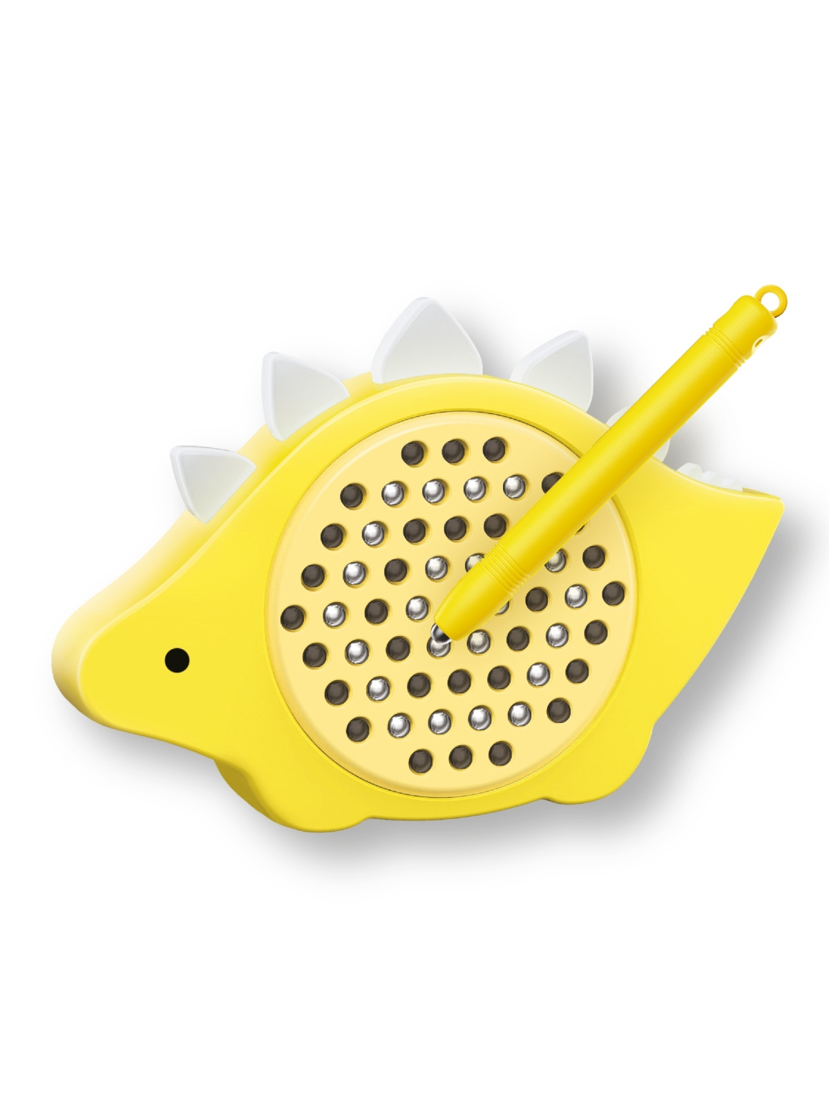 Kieszonkowa tablica magnetyczna Apli Kids Stegozaur to mała zabawka do wielokrotnego rysowania, która łączy prostą obsługę z poręcznym formatem i lubianym przez dzieci motywem dinozaura. Model w kształcie stegozaura przyciąga uwagę żółtą kolorystyką, zaokrągloną formą i dekoracyjnymi płytkami na grzbiecie. Dziecko może tworzyć na powierzchni tablicy obrazki, linie, wzory i kształty za pomocą magnetycznego rysika, który podnosi metalowe kuleczki. Gdy rysunek jest gotowy albo pojawia się nowy pomysł, wystarczy go zmazać i zacząć zabawę od początku.