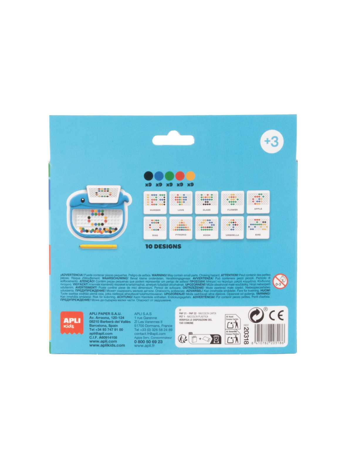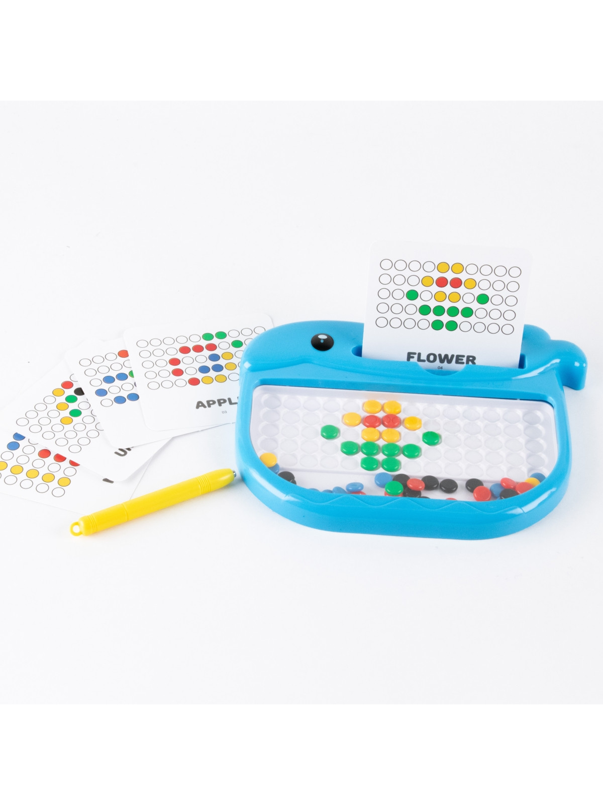• Zestaw: plansza magnetyczna, magnetyczny rysik, kolorowe magnetyczne kropki, 10 kart z wzorami