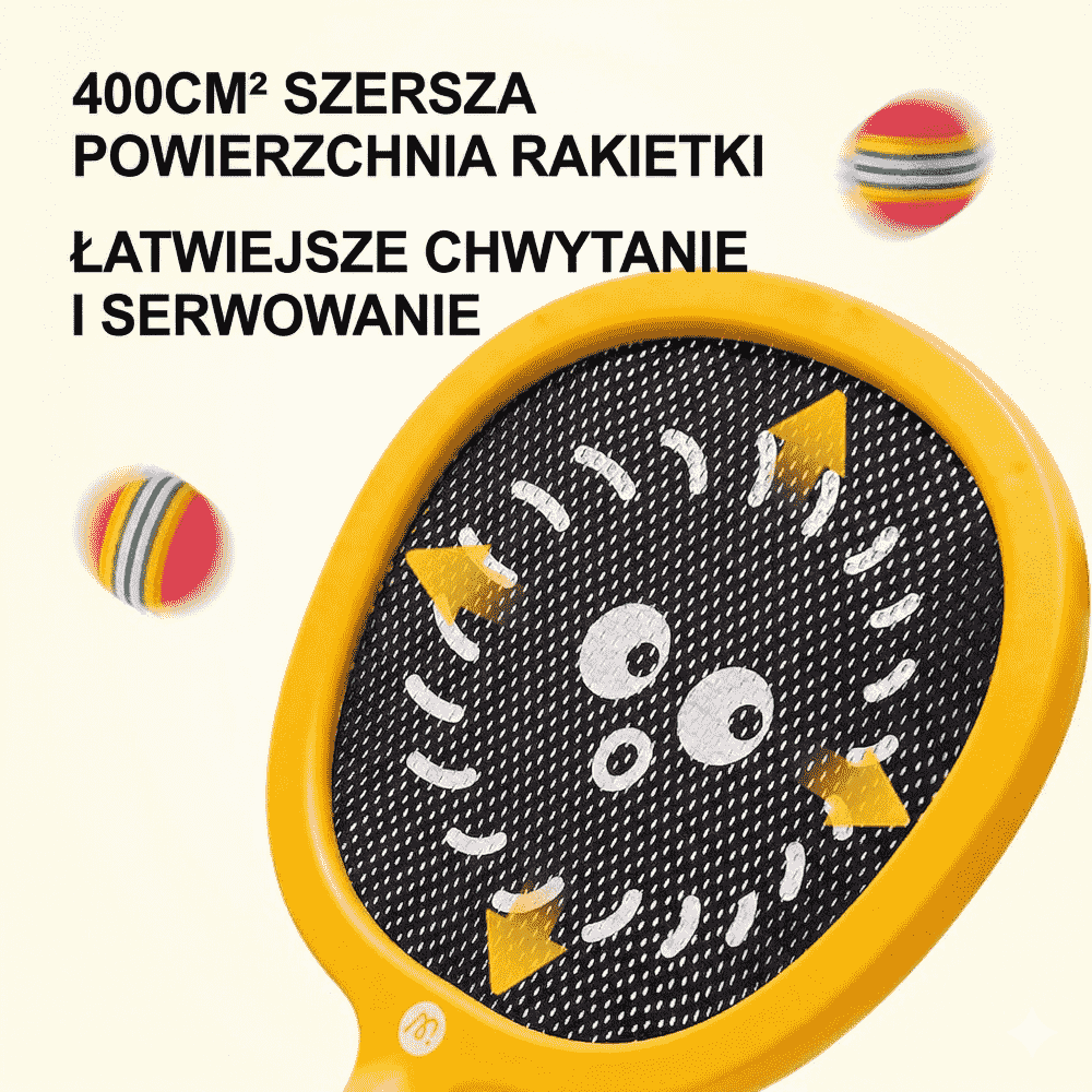 Ten zestaw nie przypomina ciężkich rakiet sportowych dla starszych graczy. Tutaj liczy się prostota, lekkość i łatwość użycia przez małe dłonie. Dwie rakietki mają czytelny, przyjazny design z zabawnymi buźkami, dzięki czemu całość wygląda bardziej jak zaproszenie do zabawy niż sprzęt treningowy. Żółta i zielona paletka pomagają też łatwo rozróżnić zestaw podczas gry w parze, co jest praktyczne w domu, na tarasie czy w ogrodzie. Dzięki temu dziecko może bawić się z rodzeństwem, rodzicem albo kolegą bez potrzeby dodatkowego przygotowania.