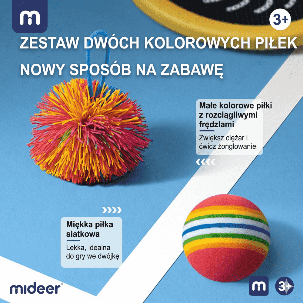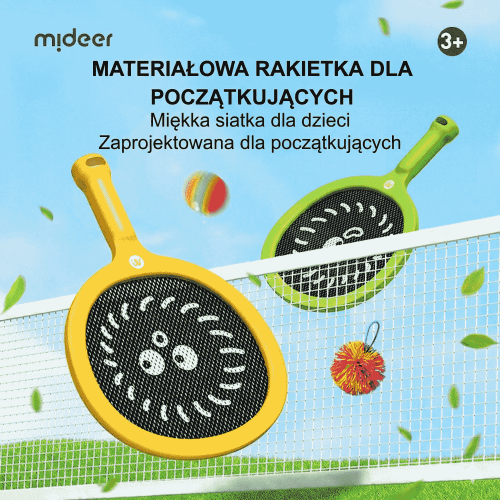 Rakietki dla dzieci Mideer z 2 piłkami to zestaw do pierwszych gier ruchowych w domu i na zewnątrz. Dwie lekkie paletki z miękką siatką ułatwiają trafienie, a różne piłki pozwalają dopasować zabawę do wieku i tempa dziecka.