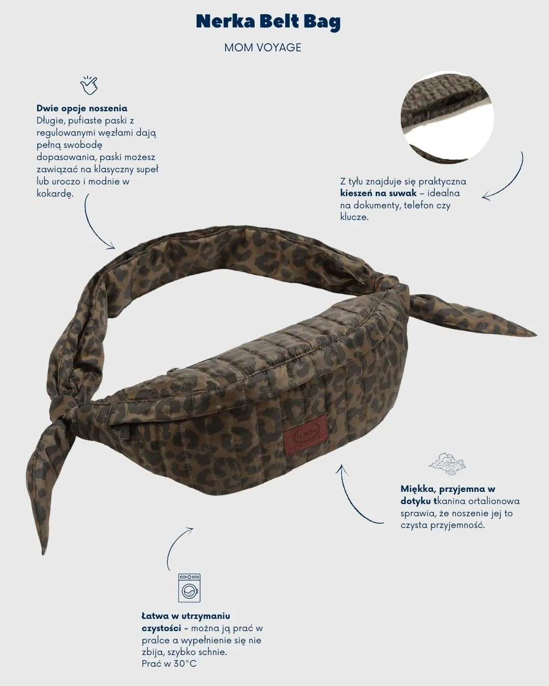 Duża nerka La Millou Leopard Cream to ultralekka, pikowana saszetka w jaśniejszej odsłonie kolekcji Leopard. Pomieści codzienne niezbędniki, ma tylną kieszeń na suwak oraz długie, „pufiaste” paski z regulowanymi węzłami, które możesz zawiązać na supeł lub w kokardę.