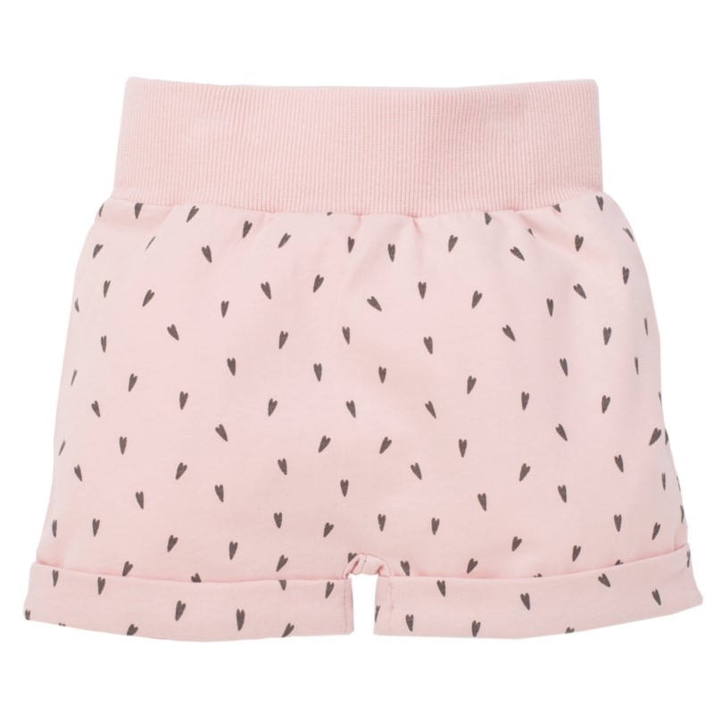 Wakacyjne krótkie spodenki w kolorze różowym, wykonane z mięciutkiej bawełny 100%. W pasie wszyty jest delikatny ściągacz, który ładnie utrzymuje spodenki na ciele, i nie uciska dziecka. Nadrukowane serduszka sprawiają, że ubranko doskonale komponuje się z pozostałymi modelami kolekcji Love Summer.