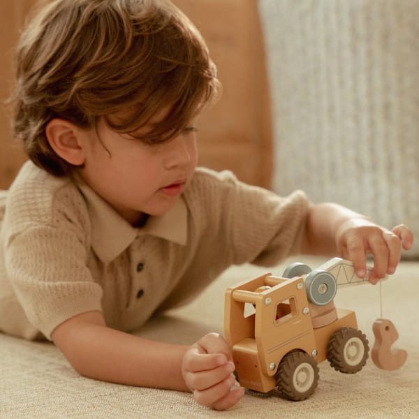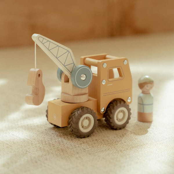 closeDrewniana ciężarówka z dźwigiem od Little Dutch to idealna zabawka dla małych budowniczych. Wyposażona w ruchome ramię i figurkę pracownika, rozwija wyobraźnię i zdolności manualne.