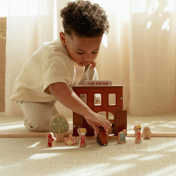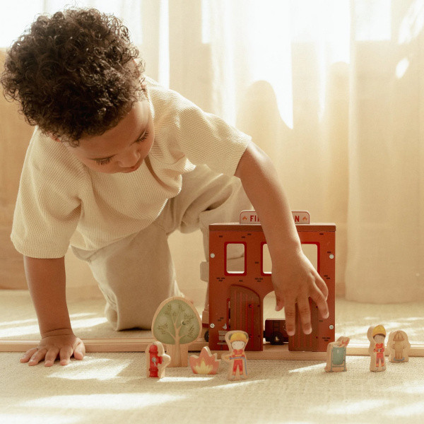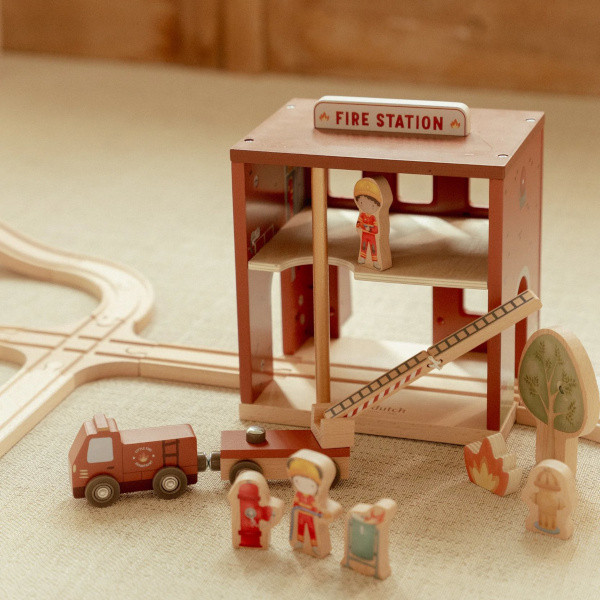 Drewniana remiza strażacka Little Dutch z autkiem, wysuwaną drabiną, strażakami i psem pomocnikiem. Idealna do zabawy w akcje ratunkowe i naukę współpracy.