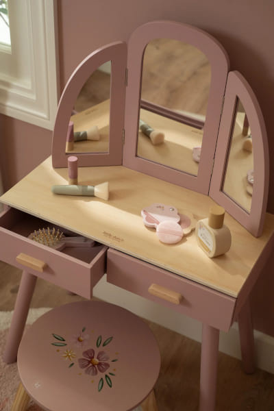 Duża drewniana toaletka Little Dutch z taboretem i kosmetykami – kącik piękności dla dziecka, który zdobi pokój, rozwija wyobraźnię i zachęca do samodzielności.