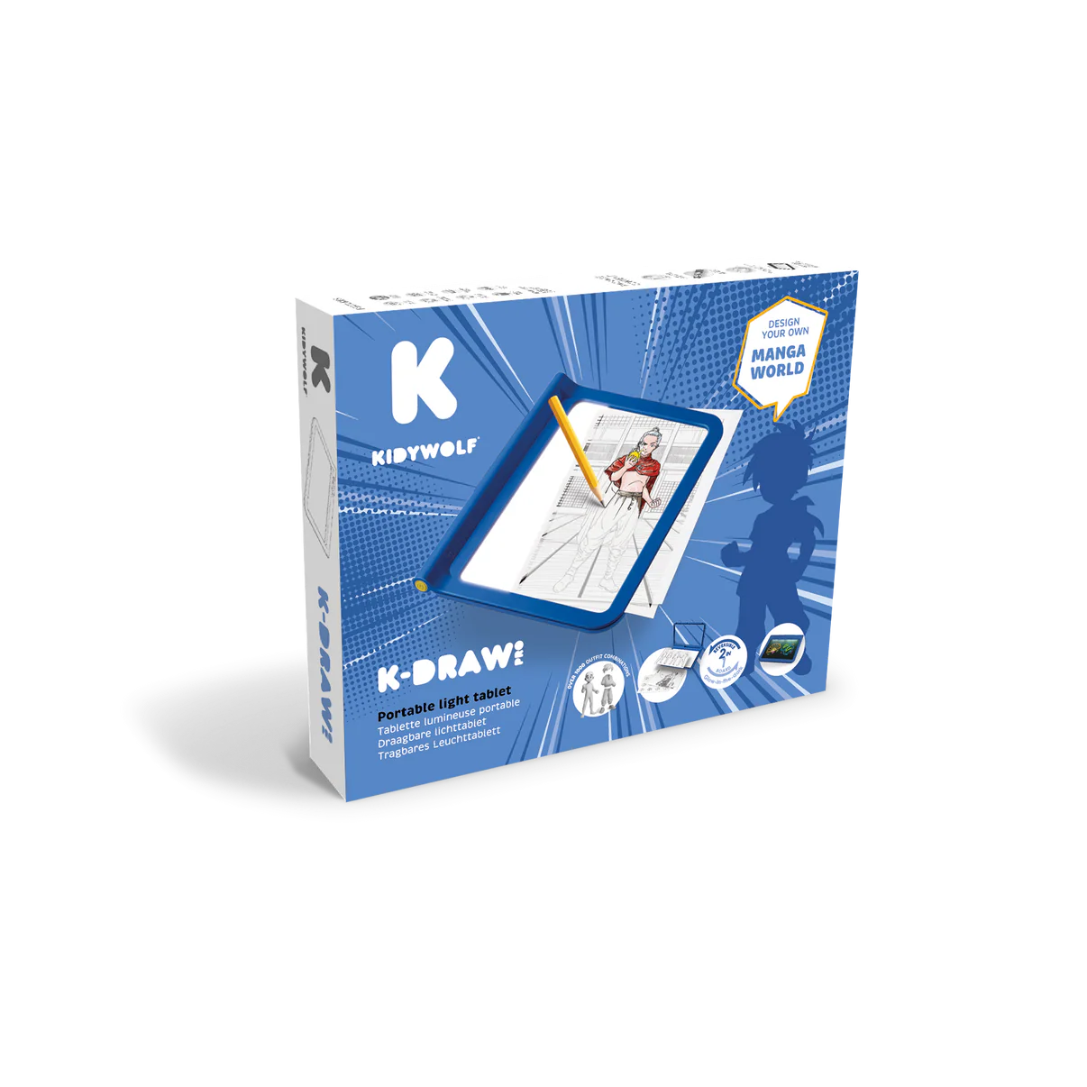 Niebieski podświetlany tablet rysunkowy KidyDraw PRO Manga KIDYWOLF to idealny wybór dla dzieci, które kochają komiksy, chcą tworzyć własne historie i szukają kreatywnej alternatywy dla czasu spędzanego przy ekranie.